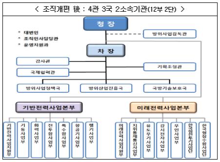 이번 조직개편은 하나의 사업부에서 사업.계약을 통합 수행하기 위해 단행된 것으로 각 사업부장의 책임 아래 사업과 계약 측면을 동시에 고려해, 방위력개선사업의 전 과정을 신속하고 일관성 있게 추진할 전망이다.