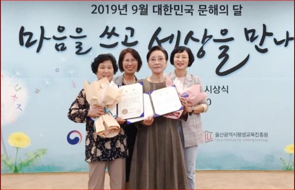 울산동부도서관(관장 한복희)에서 운영 중인 한글사랑학교 학습자 위문자, 정숙여씨가 울산시청 대회의실에서 열린 ‘2019년 울산 성인문해교육 시화전’에서 시의장상인‘슬기상’과 울산평생교육진흥원장상인‘행복한상’을 각각 수상했다고 밝혔다.